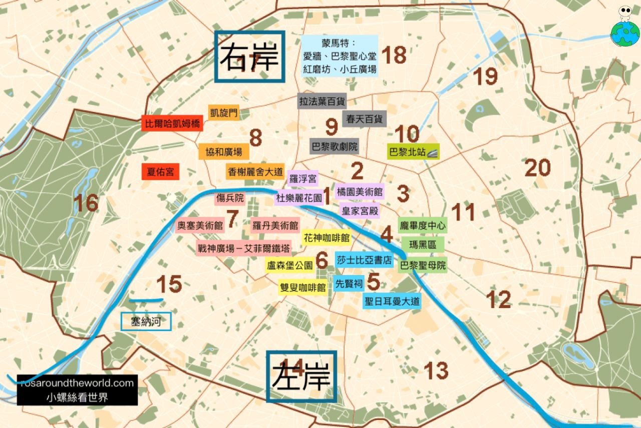 巴黎依照地區劃分為「小巴黎」和「大巴黎」,簡單來講就是市區及周邊地區的劃分,而塞納河是由東向西流:北部稱為右岸,南部稱為左岸,搭配地圖應該就比較簡單明瞭。