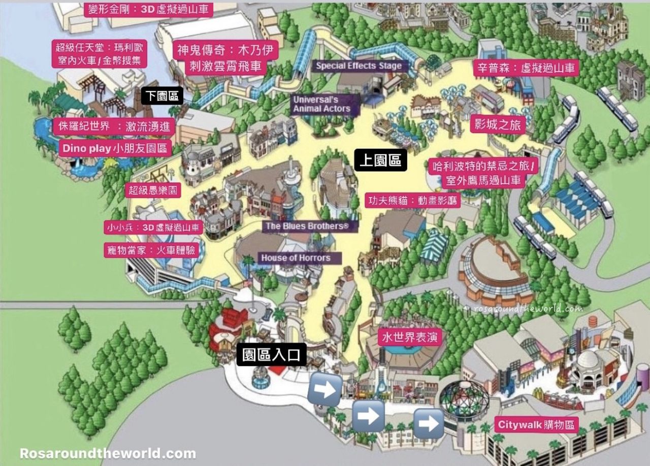 簡單來講分為上園區(Upper Lot)及下園區(Lower Lot),上下兩區各有必去的遊樂設施、表演和主題餐廳,但兩者間隔長長的手扶梯,一定要先做功課,不要盲走浪費時間。