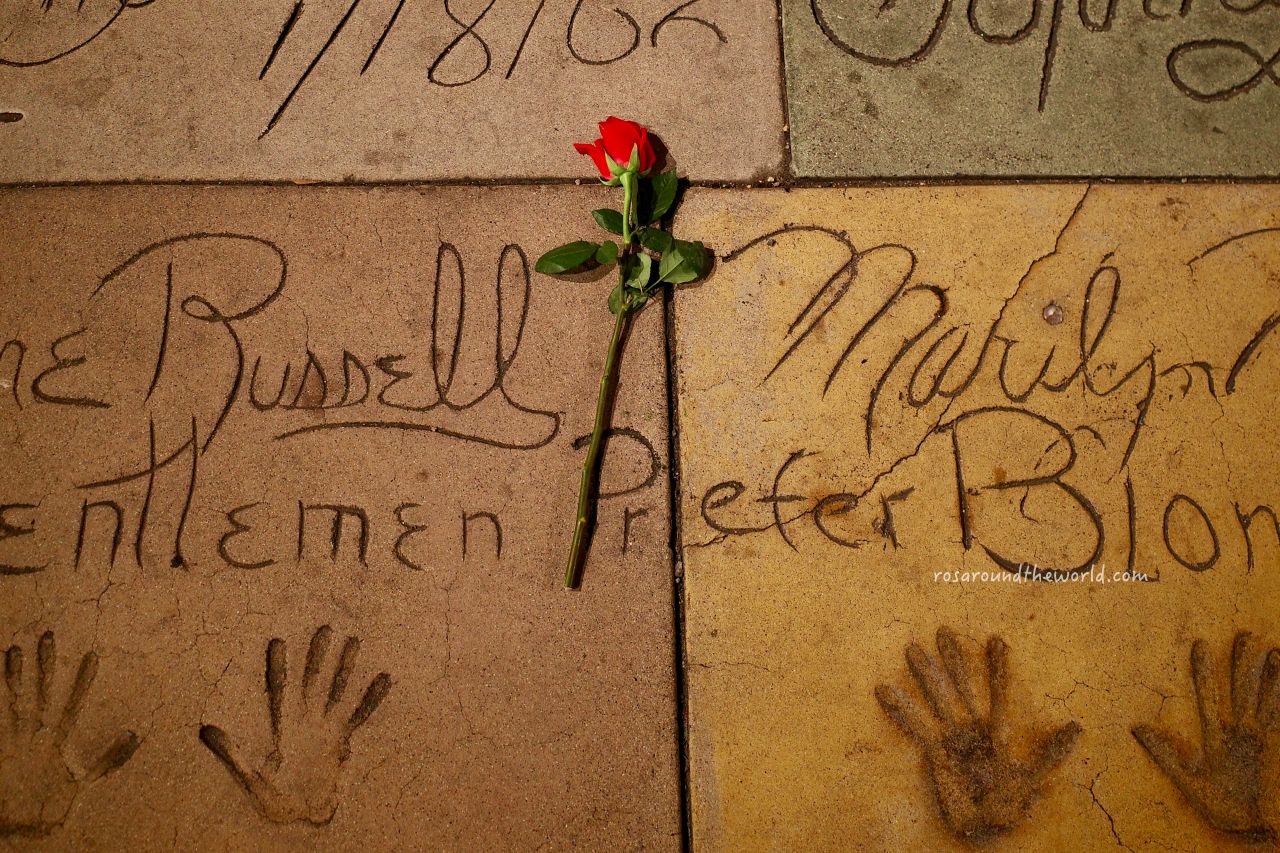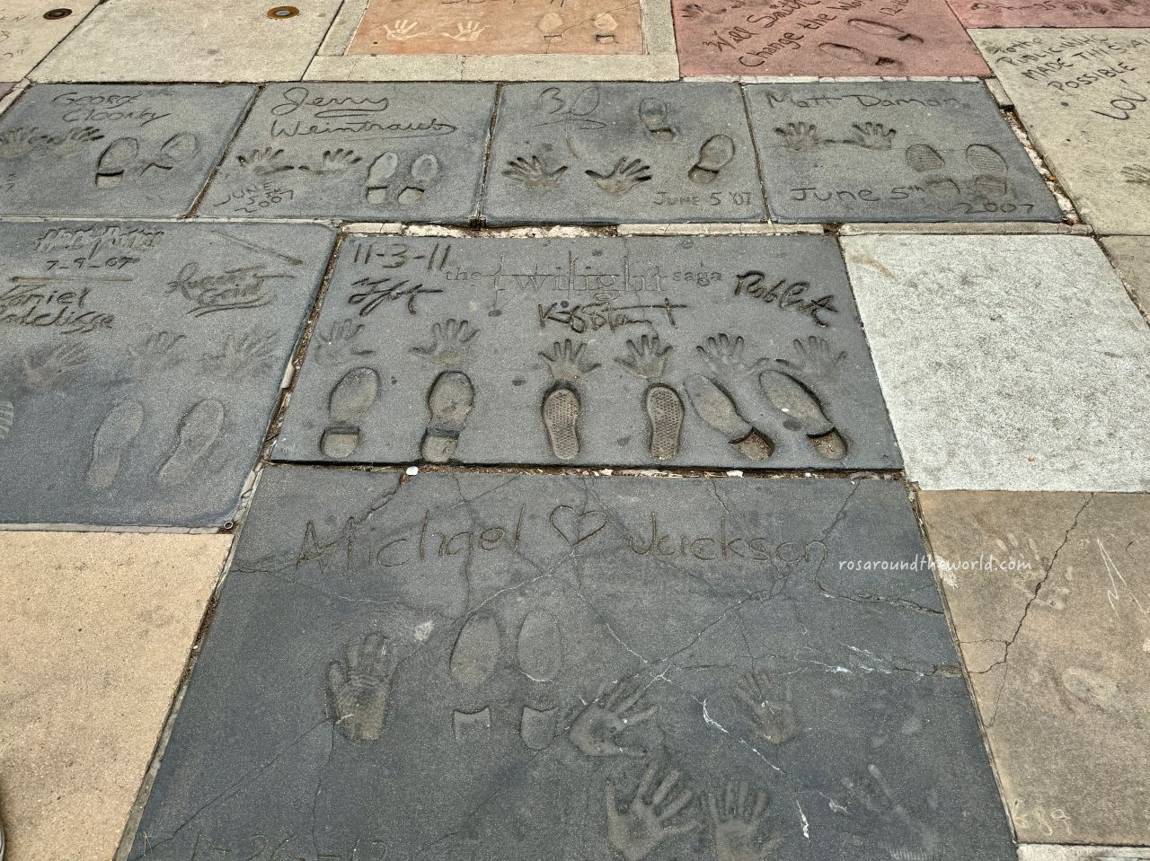 地板上有各種導演以及明星的手印、腳印或簽名,其中比較有名的華人,像是趙薇、成龍、黃曉明等,都有在裡面。