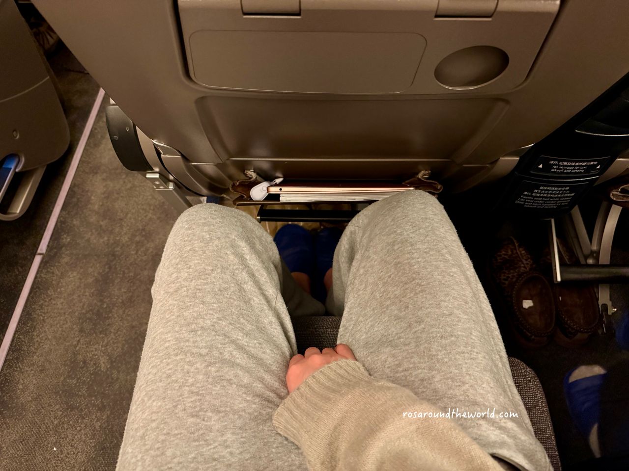 座椅明顯有比經濟艙寬大一些,我 169 公分,腳是可以完全伸直的,是採固定式椅背設計,也就是你傾斜時椅背是前滑,而不是往後俯仰。