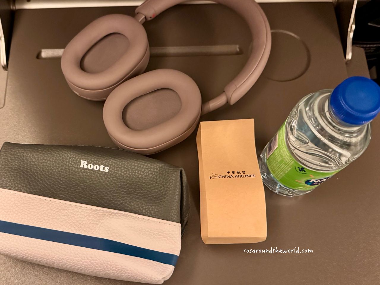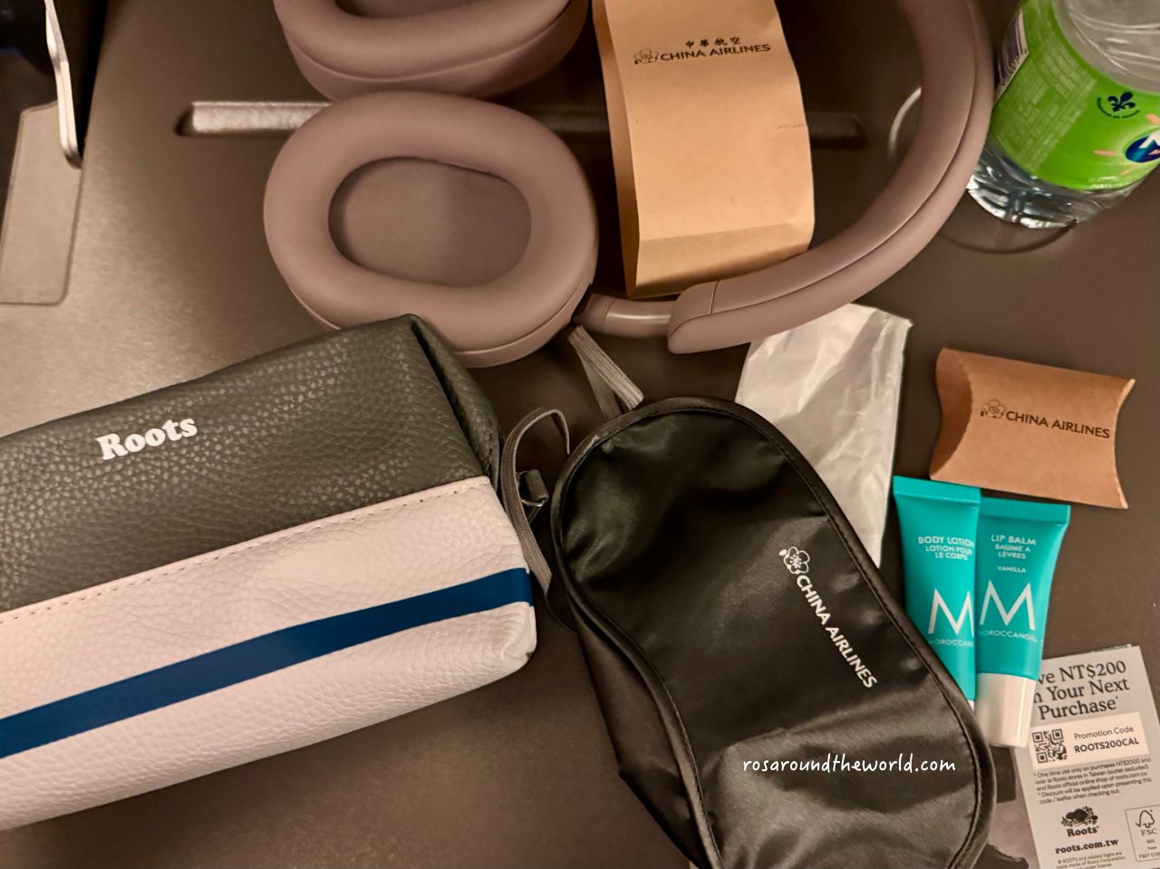 華航豪華經濟艙的過夜包是跟加拿大品牌 Roots 聯名的(之前是 The North Face),裡面的東西蠻普通,就是眼罩、摩洛哥乳液、牙刷組跟耳塞。
