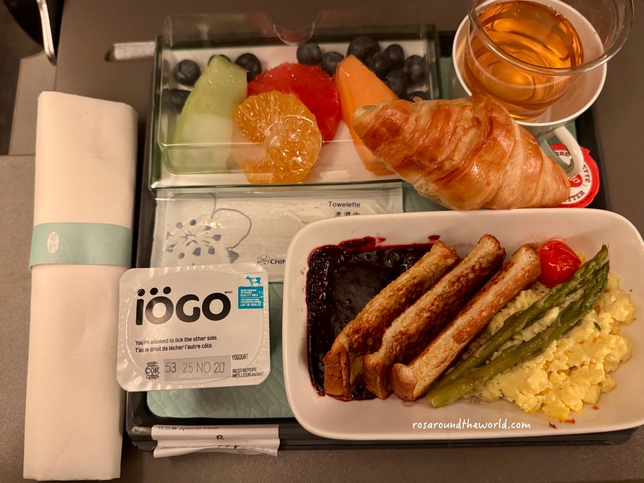 餐點我覺得很好吃,水果也真的很甜,雖然不是商務艙那種玻璃盤子(想太多?),台北出發的還是跟米其林三星頤宮合作的。